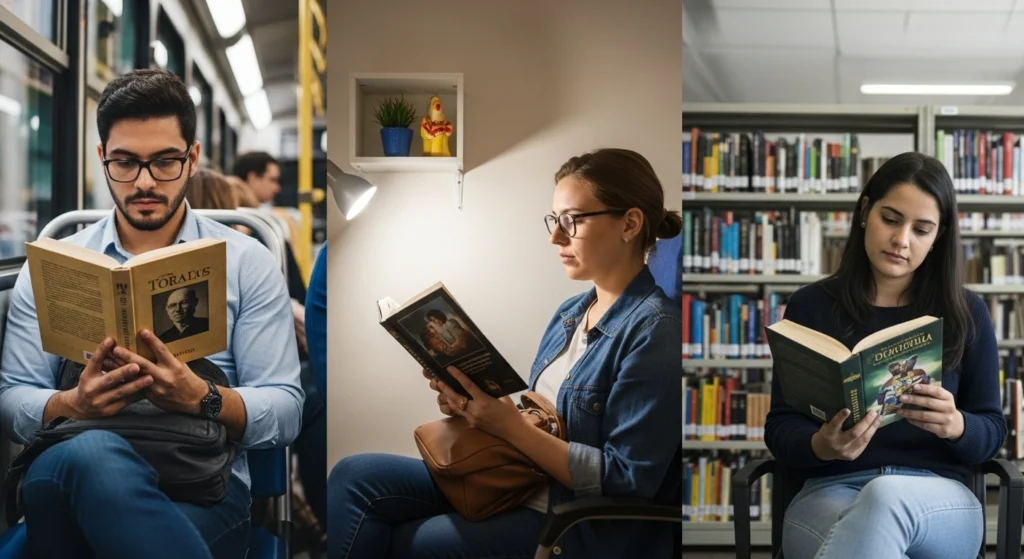 No transporte público, trechos curtos funcionam melhor do que capítulos longos. Se o caminho é irregular, combine “um trecho por dia” e o encontro vira conversa, não leitura ao vivo.