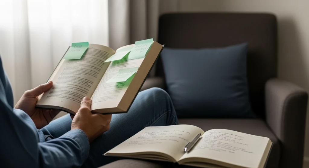 A imagem simboliza o cuidado após a leitura, mostrando que lembrar do que foi lido depende de pequenos hábitos consistentes. As anotações simples e os marcadores discretos representam a manutenção da memória e do entendimento, sem excesso de método. A cena reforça a ideia de leitura consciente, feita para permanecer, não apenas para terminar.