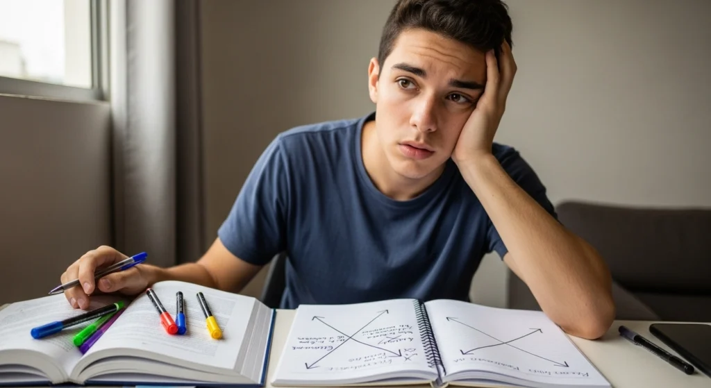 A imagem representa o momento em que o leitor não está perdido no livro em si, mas na organização do que leu. As anotações excessivas, sem hierarquia clara, mostram como os acontecimentos se acumulam sem conexão, criando confusão mesmo com esforço e atenção. A cena traduz a dificuldade prática de transformar leitura em compreensão estruturada.