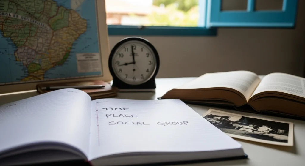 Depois, circule pronomes e marcas de tempo e lugar, como “aqui”, “lá”, “naquele dia”, “hoje”. Essas palavras mostram de onde a história está sendo vista.