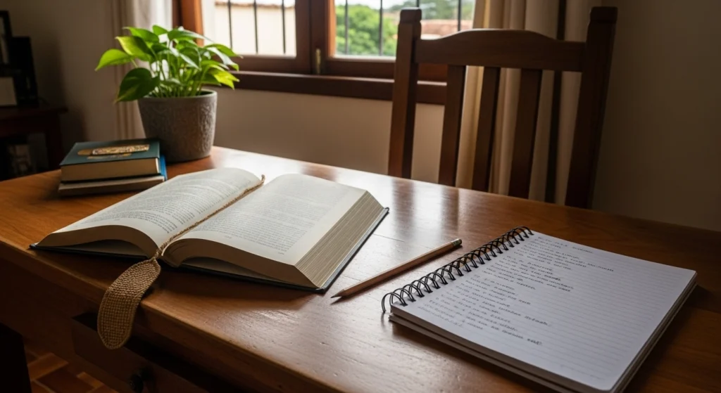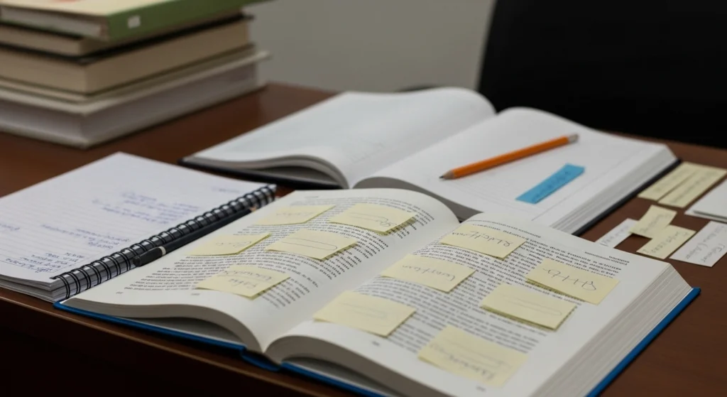 A imagem retrata uma rotina simples de estudo, focada em evitar confusões na leitura por meio de hábitos fáceis de repetir. Os marcadores e o caderno com caixas de checklist sugerem revisão constante e organização, sem depender de “inspiração”. O gesto de marcar um parágrafo indica um método prático: registrar pistas do texto para retomar depois com clareza e consistência.