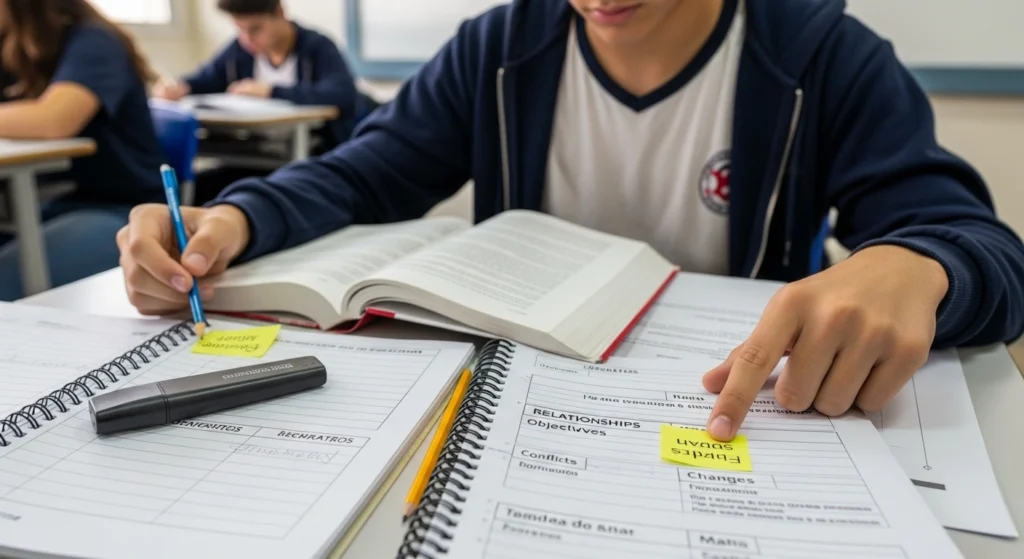 Quando o livro alternar pontos de vista, faça uma lista simples por capítulo: “voz A”, “voz B”, “cenas externas”. Assim, você não mistura tudo na hora de resumir.