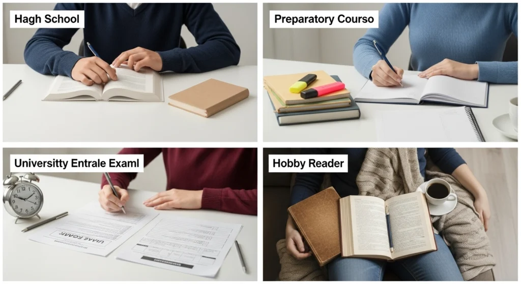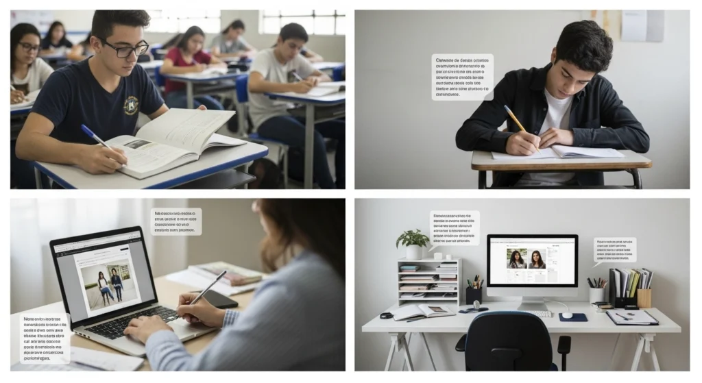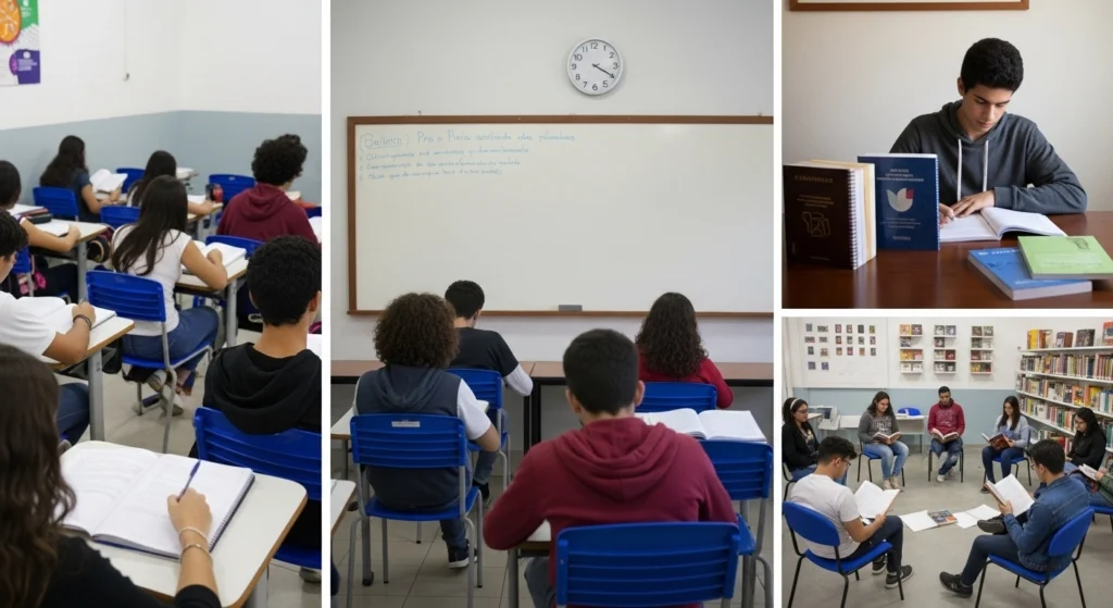 A imagem ilustra como a leitura e a interpretação mudam conforme o contexto educacional no Brasil. Cada ambiente mostra uma forma diferente de se relacionar com o texto: na escola, a leitura guiada; no cursinho, o foco em desempenho e análise rápida; no vestibular, o estudo individual e concentrado; e no clube de leitura, o diálogo e a troca de interpretações. Juntos, os cenários reforçam que o entendimento do texto é influenciado pelo espaço e pela situação em que a leitura acontece.