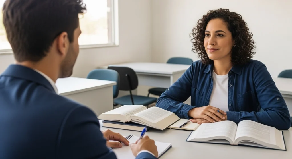 A imagem simboliza o momento em que o estudante reconhece a necessidade de apoio para avançar com segurança. O diálogo tranquilo, os materiais abertos e a postura de escuta indicam que buscar orientação não é sinal de fraqueza, mas de responsabilidade intelectual. A cena reforça a ideia de que o professor ou monitor ajuda a esclarecer limites, evitar interpretações equivocadas e transformar dúvidas em aprendizado sólido.