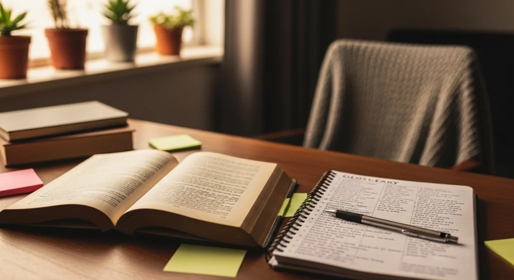 A imagem representa o processo de análise de personagem como algo investigativo e estruturado. O livro aberto simboliza o texto-base, enquanto os post-its e anotações mostram a ligação entre traços, ações e consequências. A cena reforça que analisar um personagem não é opinar, mas observar, relacionar e provar, usando evidências do próprio enredo para sustentar cada interpretação.