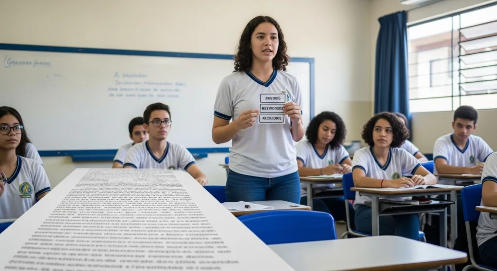 Se você travou na organização, use um esqueleto simples: abertura do assunto, explicação com argumentos ou tópicos, e um fechamento que amarra o que foi dito. Isso evita textos que começam bem e terminam “do nada”.