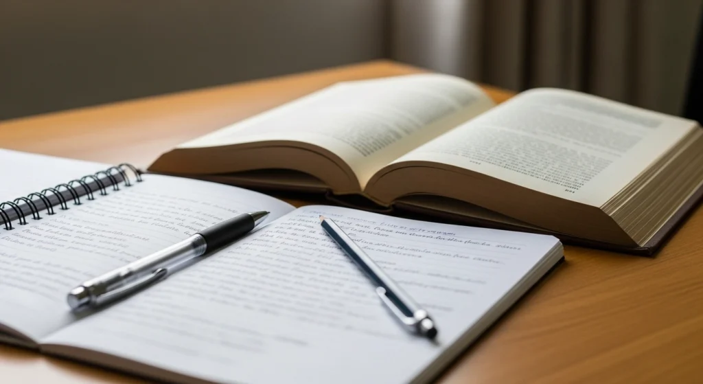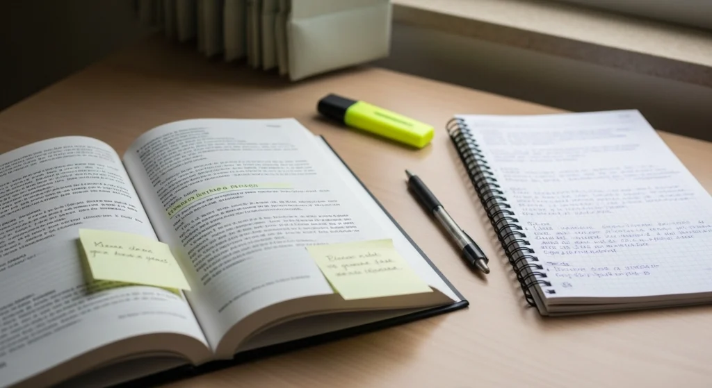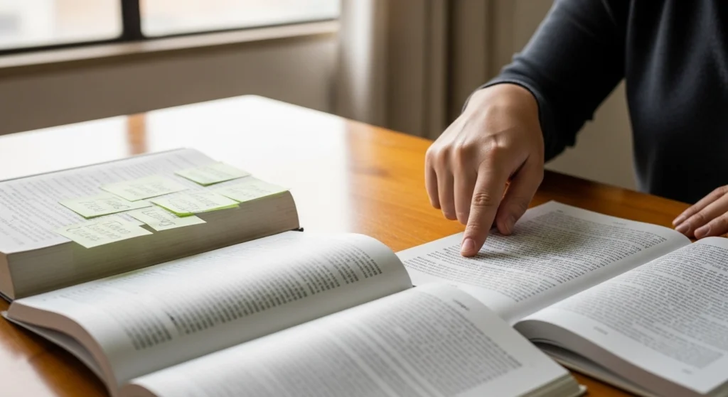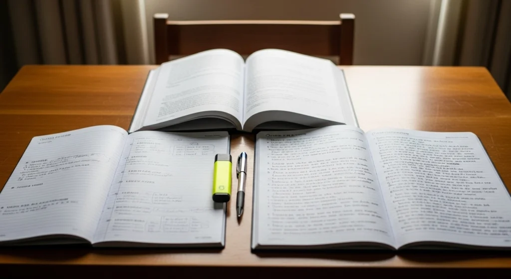 A imagem representa a passagem do julgamento emocional para a análise criteriosa. Em vez de reação imediata, o cenário sugere leitura atenta, observação e organização do pensamento. O livro aberto e as anotações reforçam a ideia de que o texto é examinado com método, não avaliado por gosto pessoal, destacando um processo racional e argumentativo de leitura.