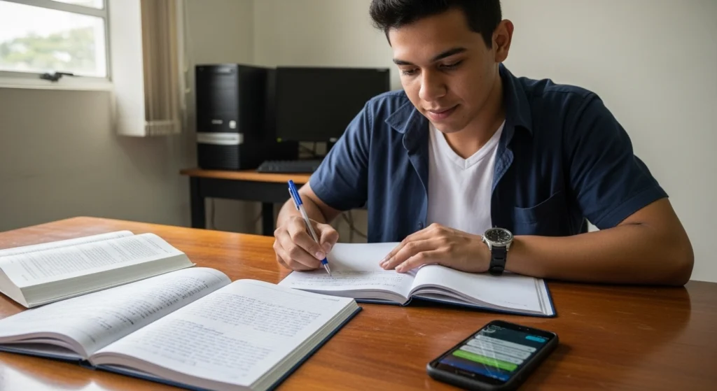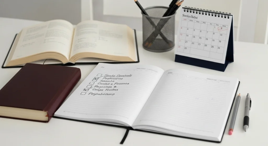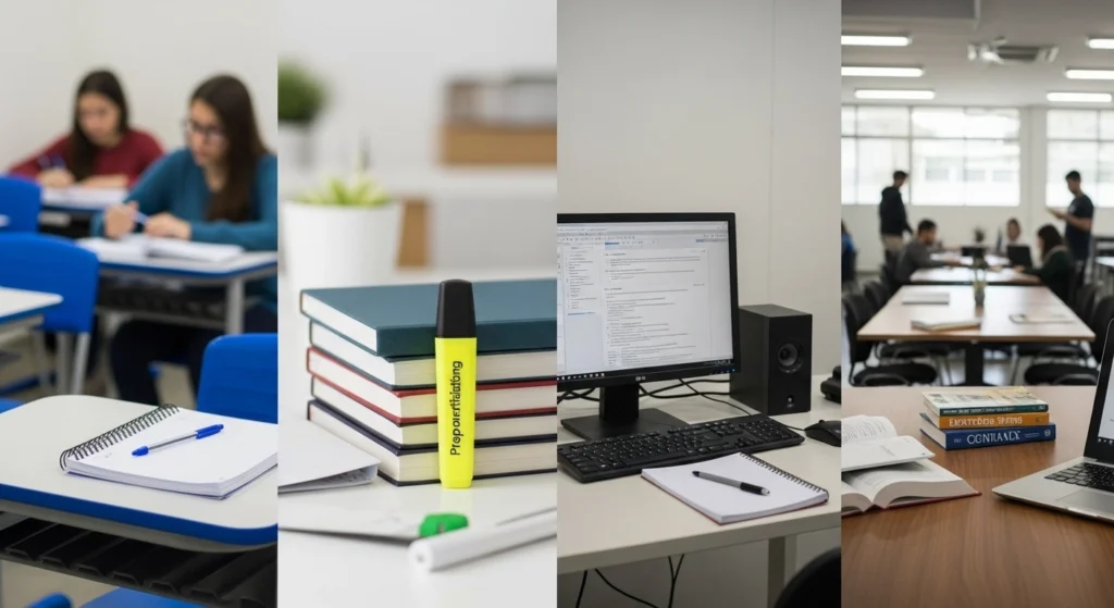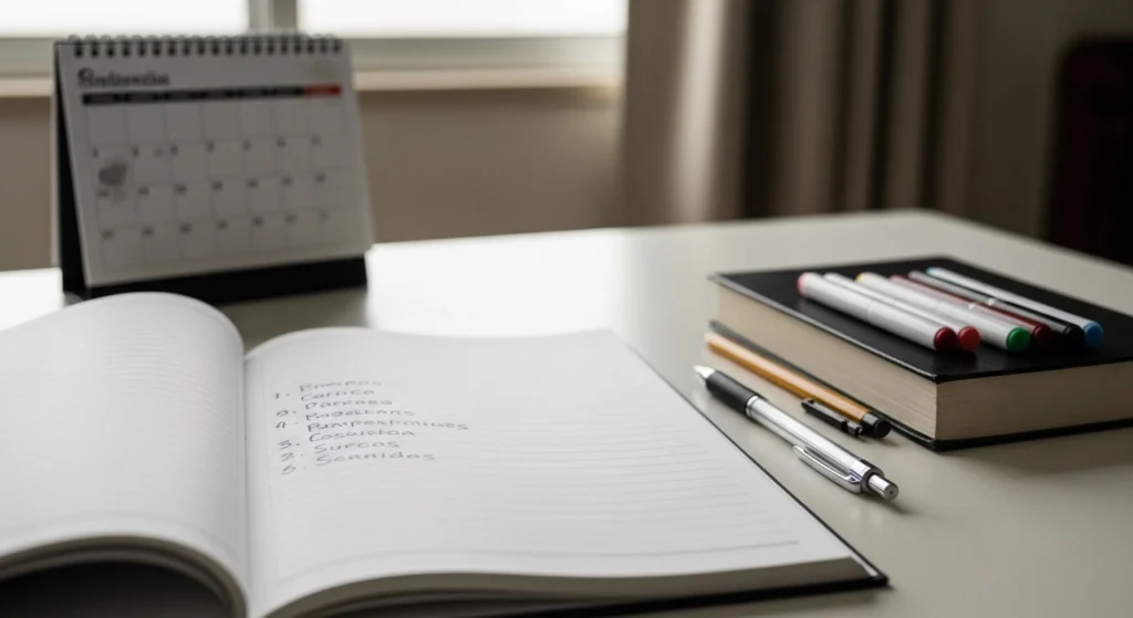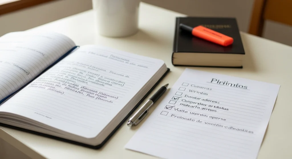 A imagem simboliza a ideia de prevenção e manutenção na escrita de resenhas. O espaço organizado, o checklist e os materiais recorrentes indicam hábito, método e melhoria contínua. Em vez de correções de última hora, o cenário sugere um processo consciente de leitura, registro e revisão, mostrando que boas resenhas nascem da prática regular e da preparação, não de improviso.